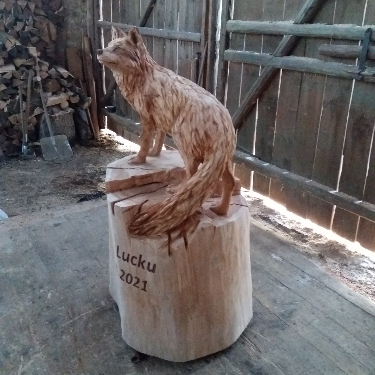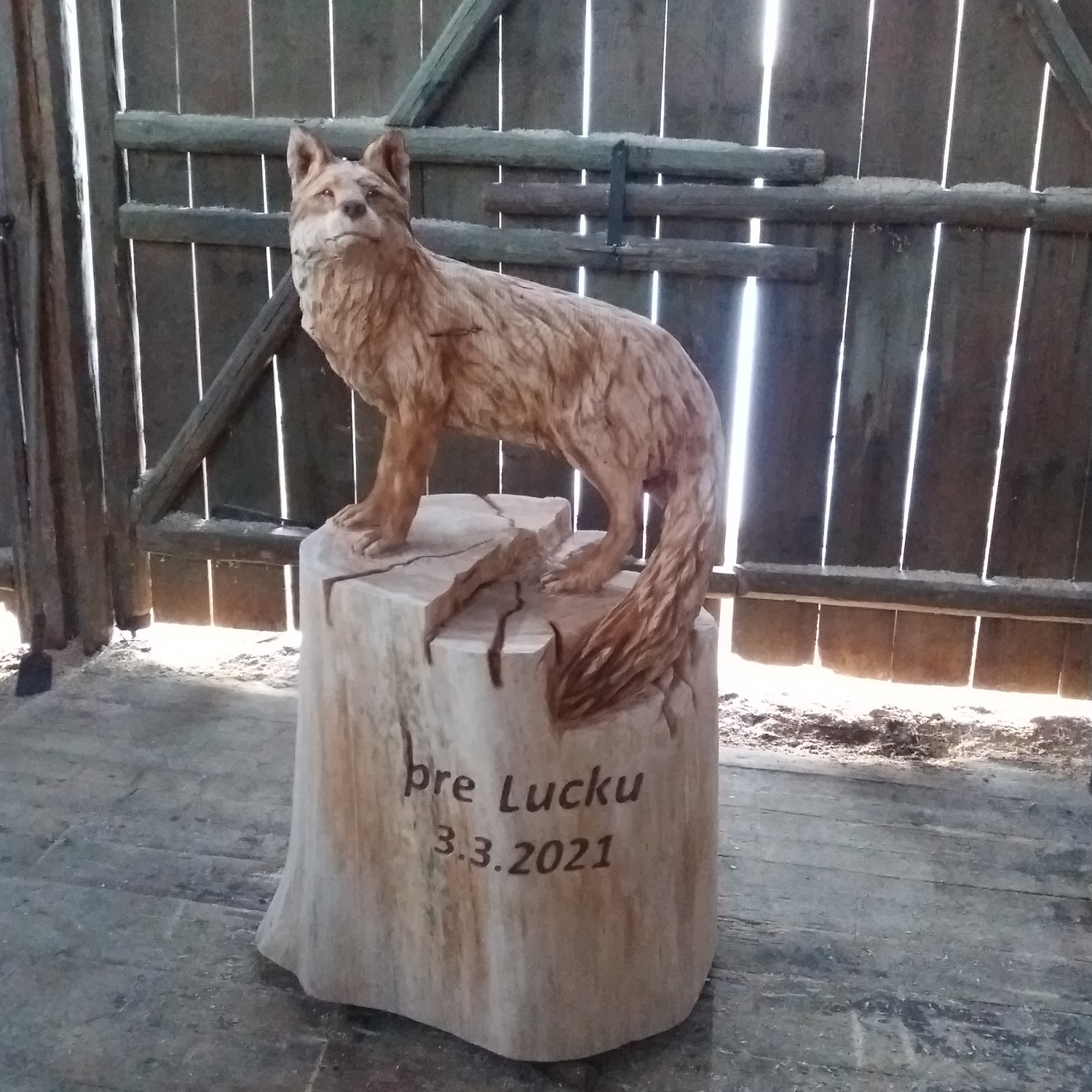 Líška je zobrazená s ladným telom, jemne modelovanou hlavou a charakteristickým chvostom. Detailne vyrezávaná srsť dodáva soche hĺbku a prirodzený vzhľad. Výraz tváre pôsobí pokojne, no zároveň ostražito, čo podčiarkuje typickú povahu tohto zvieraťa. Každý detail je starostlivo spracovaný tak, aby výsledok pôsobil harmonicky a realisticky.